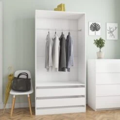 Questo armadio è realizzato in truciolato, materiale che garantisce robustezza, solidità e lunga durata. Include 2 cassetti e 1 ampio scomparto con un’asta per appendere i vestiti, ed offre ampio spazio sia per gli abiti più lunghi che per altri vestiti o accessori piegati, come maglioni, jeans, cappelli, borse, etc.