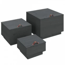 Contenitori Portaoggetti Coperchi 3pz Grigi Legno Massello Pino