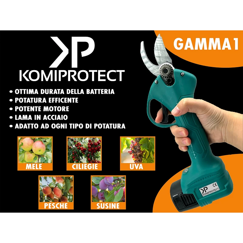 Forbice da potatura a batteria Gamma 1 di Komiprotect, con questa forbice i lavori di giardinaggio e potature di siepi e alberi da frutto sarà un piacere.