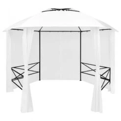 Il tetto e le tende sono realizzati in tessuto di poliestere con rivestimento in PA. Il telaio è solidamente costruito in acciaio robusto verniciato a polvere, quindi è resistente alla ruggine e considerato stabile. Il tettuccio presenta un elegante design a doppia ventilazione che consente un migliore passaggio dell’aria. Inoltre, le tende in poliestere facili da pulire possono essere chiuse per fornire maggiore privacy o tenute aperte con i fermatenda inclusi. Questo gazebo sarà sicuramente una scelta perfetta per le vostre riunioni in giardino.