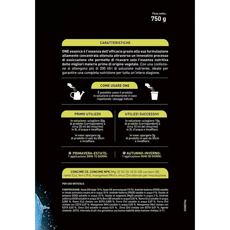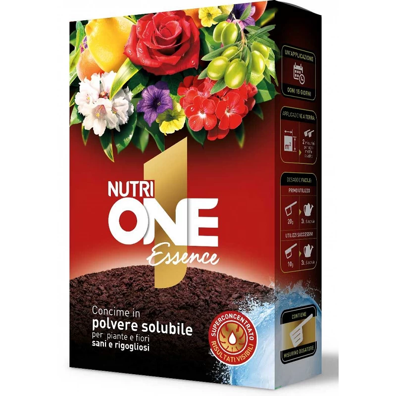 ONE Essence è l’essenza dell’efficacia: una nuova formulazione altamente concentrata in cristalli idrosolubili, ottenuta attraverso un innovativo processo di essiccazione e concentrazione della materia prima che garantisce la massima efficacia nutritiva del formulato. Il prodotto è indicato per la concimazione di ogni tipo di pianta e fiore.