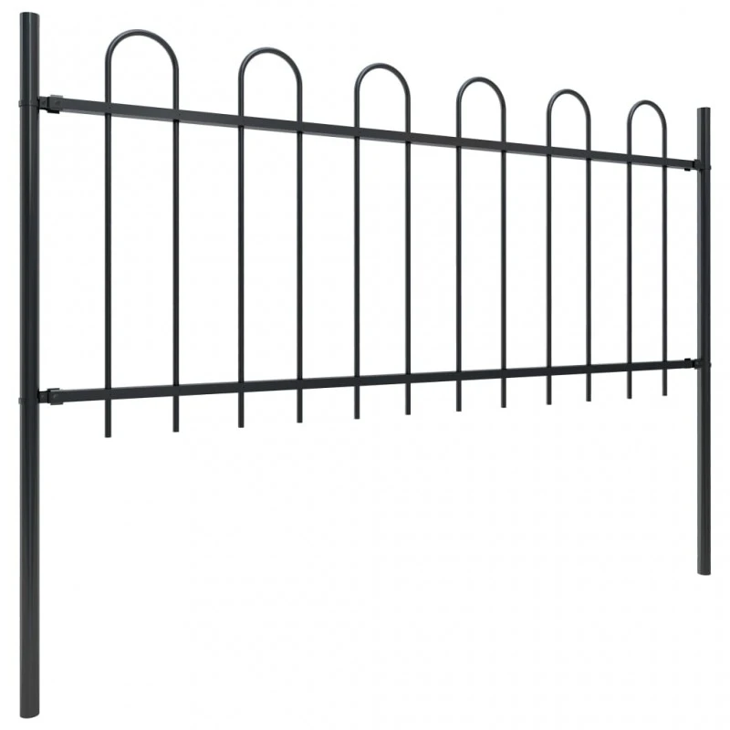 Con barre verticali sormontate da punte tonde e robuste assi orizzontali di rinforzo per il telaio, questa recinzione per giardini offre un alto grado di sicurezza. Il recinto è realizzato in acciaio ad elevata resistenza verniciato a polvere, materiale che rende il prodotto estremamente resistente, robusto e durevole. Grazie ai materiali di montaggio inclusi la recinzione è facile da assemblare.