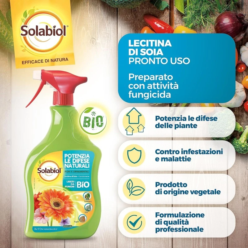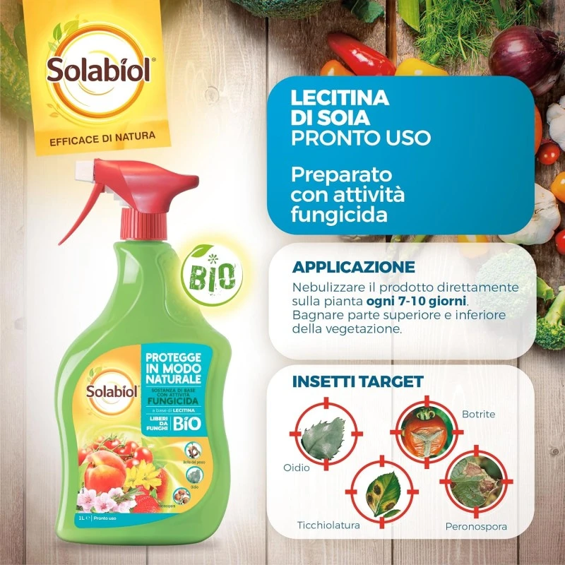 La Lecitina di Soia è un prodotto 100% di origine naturale in grado di combattere le principali malattie fungine (oidio, ticchiolatura e ruggine), agendo per contatto diretto inibendo la germinazione delle spore micotiche. La Lecitina di Soia, grazie alle sue particolari caratteristiche, rende la pianta più resistente all’attacco di patogeni fungini (tra cui oidio, peronospora, ruggine) in quanto potenzia i naturali meccanismi di difesa dei tessuti vegetali colpiti.